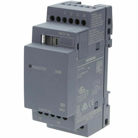 Erweiterungsmodul Siemens LOGO! DM8R eingangsspannung: 24V AC/DC, ausgänge: relais, 4-IN (digitale eingänge), 4 OUT(digitale ausgänge), NPN-eingangDas erweiterungsmodul LOGO!8 DM8 24R – 6ED1055-1HB00-0BA2 Siemens verfügt über die schutzart IP 20 und eine versorgungsspannung von 24 V AC/DC. 4 digitale Eingänge und 4 digitale Ausgänge (Relais). Das erweiterungsmodul LOGO!8 DM8 24R – 6ED1055-1HB00-0BA2 wird die montage auf eine DIN-schiene von 35 mm. Das mini-control-systeme LOGO8! Siemens verwendet werden, z.b. in systemen zur steuerung von maschinen, anlagen, pumpen, filterung und transport und auch in überwachungs-und hochbau.