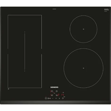 Siemens iQ500 Induktionskochfeld EE651BPB1E abgeschrägte Kanten. Mit dem Kombi-Induktionskochfeld stehen Ihnen neue Kochmöglichkeiten zur Verfügung. Dank der touchControl können die Garzonen per Fingerdruck aktiviert und gesteuert werden. Neue Induktionstechnologie: Schnell, sauber und sicher kochen Dank der powerBoost-Funktion beträgt die Vorheizzeit bis zu 50% mehr. Design: – Digitalanzeige. – TouchControl-Steuerung (+/-). Leistung: – 4 Induktionskochplatten einschließlich einer ausziehbaren CombiZone-Zone. – Kochzonen: 1 x Ø 180 mm, 1,8 kW (PowerBoost 3,1 kW), 1 x Ø 180 mm, 1,8 kW (PowerBoost 3.1) kW), 1 x Ø 145 mm, 1,4 kW (PowerBoost 2,2 kW), 1 x Ø 210 mm, 2,2 kW (PowerBoost 3,7 kW). Komfort / Sicherheit: – QuickStart-Funktion: automatische Erkennungsbehälter in der Kochzone – Neustart-Funktion: Bei einem plötzlichen Anhalten des Kochfelds 4 Sekunden lang die Anfangstemperatur speichern – 17 Einstellpositionen – PowerBoost auf jeder Kochplatte – Timer auf jeder Kochplatte – 2-stufige Restwärmeanzeige – Kindersichere Verriegelung. – Produktgruppe: Kochfeld.