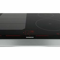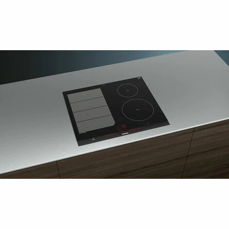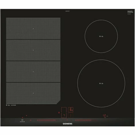 Siemens iQ700 Induktionskochfeld EX675LEV1F schwarz mit Edelstahlprofil. Das innovative Induktionskochfeld? Dank des thermoSensor.Home Connect: Informationen zum Kochfeld, keine Fragen mehr – mit der benutzerfreundlichen Home Connect-App. Mit dem CookConnect-System können Sie die verschiedenen Funktionen der Haube über das Kochfeld Cook steuern frei dank der extra großen Kochfläche: Sie können Ihr Geschirr überall in der flexInduction-Zone platzieren. powerMove Plus ermöglicht eine intuitive Steuerung dank drei vordefinierter Kochzonen mit unterschiedlichen Temperaturen. Für eine einfache und intuitive Steuerung des Kochfelds. Der thermoSensor steuert automatisch Die Temperatur in der Pfanne, damit das Essen nicht mehr brennt. Design: Digitalanzeige. Dual LightSlider-Steuerung. Leistung: 4 Induktionskochplatten, einschließlich 1 FlexInduktionskochen (Freizone mit 4 ovalen Induktoren). Kochzonen: 1 x Ø 380 mm x 240 mm, 3,3 kW (PowerBoost 3,7 kW) oder 2 x Ø 190 mm, 2,2 kW (PowerBoost 3,7) kW), 1 x Ø 145 mm, 1,4 kW (PowerBoost 2,2 kW), 1 x Ø 210 mm, 2,2 kW (PowerBoost 3,7 kW) Komfort / Sicherheit: Home Connect: Fernbedienung cookConnect: Haubensteuerung Funktion QuickStart: automatische Erkennung von Containern in der Kochzone Neustartfunktion: Bei plötzlichem Anhalten des Kochfelds 4 Sekunden Speicherung der Anfangstemperatur PowerMove Plus: 3 voreingestellte Leistungen Anzeige des Energieverbrauchs 17 PowerBoost-Einstellpositionen an jedem Herd PanBoost: Spezialverstärker für Öfen Timer an jedem Ofen Reinigungstaste: Möglichkeit, das Bedienfeld für 20 Sekunden zu blockieren, um das Kochfeld bei Überlauf zu reinigen. – Produktgruppe: Kochfeld.