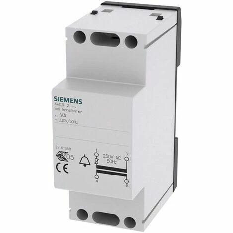 Klingeltransformator, 8VA Primär 230-240V AC, 50Hz, Sekundär 8V, 12V AC mit PTC-Sicherung, 2TE++ Klingeltransformatoren zum Ansteuern von Klingeln, Gongs, Türöffnern oder Fernschalter. Die typische Anwendung dieser Klingeltransformatoren ist die Kurzzeitnutzung, wie sie bei Klingeln, Gongs, Türöffnern oder Fernschaltern im Wohnbau auftritt. Die Sekundärbemessungsspannungen reichen von AC 4 V bis 24 V. Siemens Klingeltransformatoren sind durch einen PTC-Widerstand gegen Kurzschluss oder mäßige Überlast geschützt. Ob für Infrastruktur oder für industrielle Anforderungen, Siemens bietet Klingeltrafos für alle Anwendungen und jedes Einsatzgebiet. Die Netzgeräte von Siemens zeichnen sich vor allem aus durch: 1. Komfortable und einfache Montage- sowie Anschlusstechnik. 2. Zuverlässige Sicherheit bei der Installation dank standardmäßigem Berührungsschutz. 3. Integrierter Kurzschluß und Überlastschutz. 4. Optimale Technik für sichere Spannungsversorgung für Ihre Sicherheit – nur von Siemens. Siemens bietet für die sichere, effiziente elektrische Infrastruktur in Gebäuden und Industrie ein durchgängiges Portfolio an Schutz-, Schalt-, Mess- und Überwachungsgeräten, Verteilersysteme sowie Schaltern und