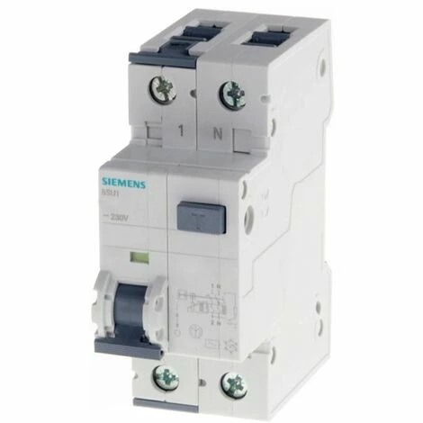 Siemens Magnetothermischer Differenzialschalter, 2 Module, DIN-Anschluss (universell für jede Schalttafel auf dem Markt), 1P+N, 6 Ampere, Ausschaltvermögen 6kA, Nennspannung 230/240 Vac, Nenndifferenzstrom 30mA, Typ A, Auslösekurve C.