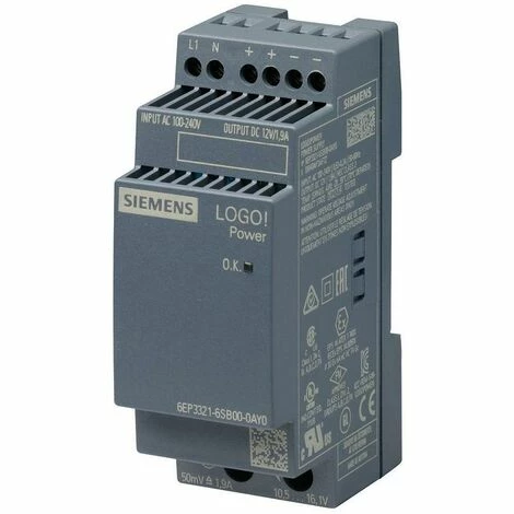 Siemens LOGO!POWER 12 V / 1,9 A Geregelte Stromversorgung Eingang: AC 100-240 V Ausgang: DC 12 V / 1,9 A Die Mini-Netzgeräte LOGO!Power im Design der LOGO!8-Module bieten viel Leistung auf kleinstem Raum. Der gute Wirkungsgrad über den gesamten Lastbereich und die geringe Verlustleistung im Leerlauf garantieren einen effizienten Betrieb. Der Weitbereichseingang für 1-phasige Netze und für Gleichspannungsnetze, sowie die Leistungsreserve beim Einschalten kapazitiver Lasten, erfüllen Anforderungen zahlreicher Applikationen. Einen universellen Einsatz ermöglichen auch der große Temperaturbereich und umfangreiche Zertifizierungen. Die zuverlässigen Stromversorgungen mit ihrem flachen stufenförmigen Gehäuse lassen sich höchst flexibel integrieren – beispielsweise in Installationsverteilern. Egal welche Branche, egal welche Anforderung – Siemens bietet zuverlässige und