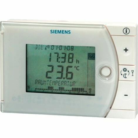 Raumthermostat für Heizungs- oder Kühlungsanwendungen. LCD-Anzeige mit grossen Ziffern, hohem Kontrast, Klartextanzeige (bis zu 18 Zeichen) und Beleuchtung. Unterstützt 15 europäische Sprachen und eine Betriebsart nur mit Symbolen. 2-Punktregler mit PID-Verhalten selbstlernend (patentiert). Sollwertbereich jeweils 3…35°C (Sollwertbegrenzung umschaltbar 3…35°C/ 16…35°C). Gehäusefarbe signalweiß RAL 9003 – Sockelfarbe grau RAL7038. Abmessungen (BxHxT): 134,5 x 90 x 30mm.
