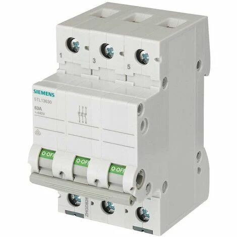 Siemens Ausschalter 100A 3-polig Ein- und Ausschalter zur Hutschienenmontage für das Steuern elektrischer Anlagen. Die Ein- und Ausschalter 5TL1 werden zum Schalten von Beleuchtungen, Motoren und sonstigen elektrischen Geräten eingesetzt. Die Bemessungsströme reichen von 32 A bis 125 A. Die Gerätevarianten 5TL1 sind darüber hinaus einsetzbar als Lasttrennschalter nach EN 60947-1. Die Geräte dürfen nach EN 60204-1 als Hauptschalter zum Trennen oder Freischalten von Anlagen verwendet werden. Ob Infrastruktur oder industrielle Anforderungen – Siemens bietet Schaltgeräte für alle Anwendungen und jedes Einsatzgebiet. Durch das neue Design lässt sich der Ein- und Ausschalter 5TL1 in die Reihe der FI-Schutzschalter und Leitungsschutzschalter optisch perfekt integrieren. Die Schaltgeräte von Siemens zeichnen sich vor allem aus durch: 1.Erhöhte Betriebssicherheit und Anlagenverfügbarkeit dank separater Ein- und Ausschaltung des betroffenen Stromkreises. 2. Zuverlässige Sicherheit bei der Installation dank standardmäßig enthaltenen Umgreif- und Berührungsschutz. 3. Werkzeugloses Lösen von der Hutschiene bzw. aus dem Sammelschienenverbund durch komfortable Schieber-Hand-Betätigung. 4. Klar ersichtliche Schaltstellungsanzeige. 5. Einsetzbar als Lasttrennschalter und Hauptschalter. 6. Die Ein – und Ausschalter entsprechen den Bestimmungen der EN 60947-1 und EN 60204-1. 7. Optimale Technik für Ihre Sicherheit – nur von Siemens. www.siemens.de/lowvoltage. Siemens bietet für die sichere, effiziente elektrische Infrastruktur in Gebäuden und Industrie ein durchgängiges Portfolio an Schutz-, Schalt-, Mess- und Überwachungsgeräten, Verteilersysteme
